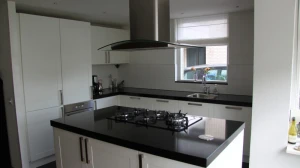 De koof loopt door naar de woonkamer zodat keuken en woonkamer één geheel vormen.